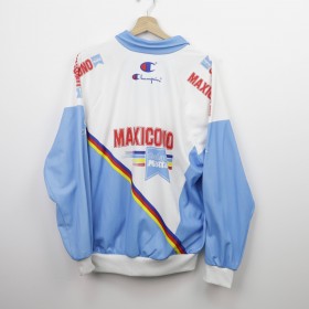 1990/1991 Parma Champion Maxicono full zip training and representation jacket. Classic white and light blue design featuring Maxicono and Gelati Motta sponsors, with multicolor diagonal detail on front and back. Embroidered Champion logos and sponsor details on chest and sleeves. Long sleeve vintage model with side pockets and full zip. An iconic piece from Parma’s golden years, perfect for collectors and vintage football fans.