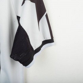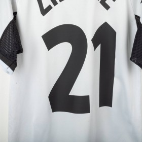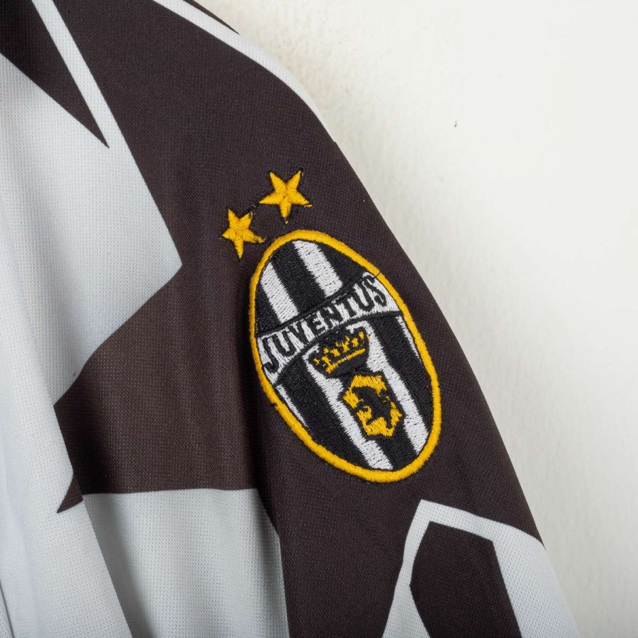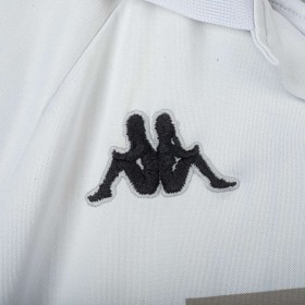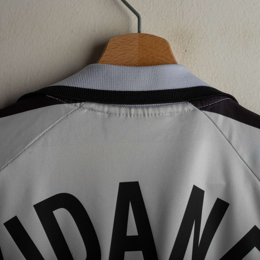 Juventus away shirt from the 1998/1999 season, made by Kappa for the “Kappa Gara” line. White base with black geometric pattern on the sleeves. Embroidered Kappa logo on the chest and stitched Juventus crest with two stars on the sleeve. Sublimated “D+ Libertà Digitale” front sponsor. Zidane name and number 21 printed on the back in the official font. Tight fit. Size S.
