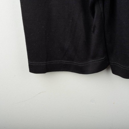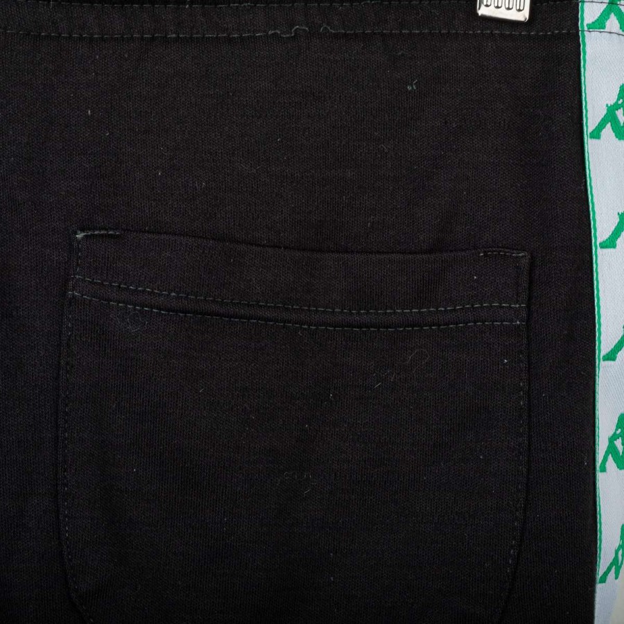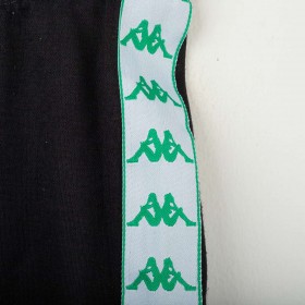Juventus shorts from the 1990/1991 season, made by Kappa. Black color with white side bands featuring repeated green Kappa logos. Green printed Kappa logo on the left leg. Elastic waistband with internal drawstring. Lightweight polyester fabric, typical of vintage training gear of the era. Size S as per original stitched inner tag. Original vintage shorts from the 1990/1991 season.