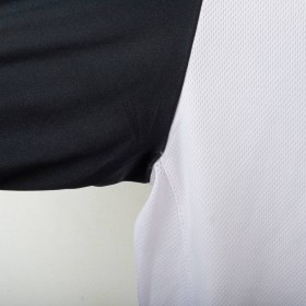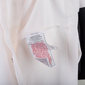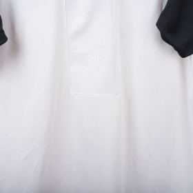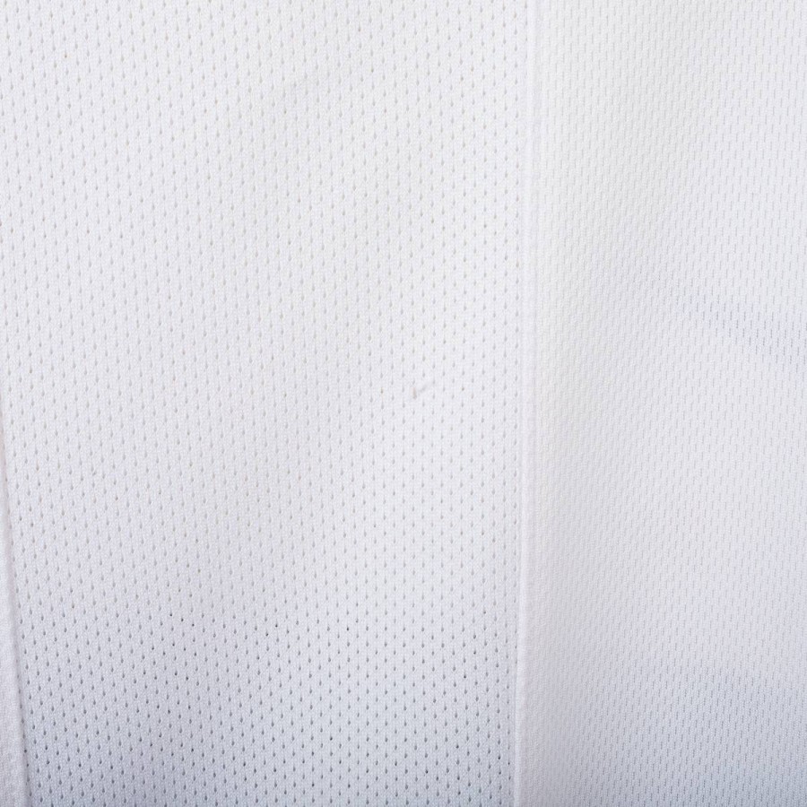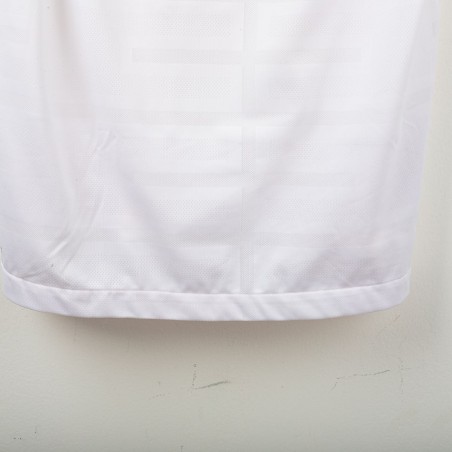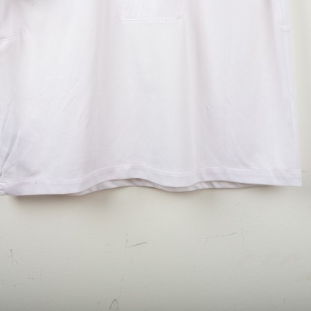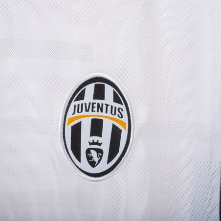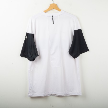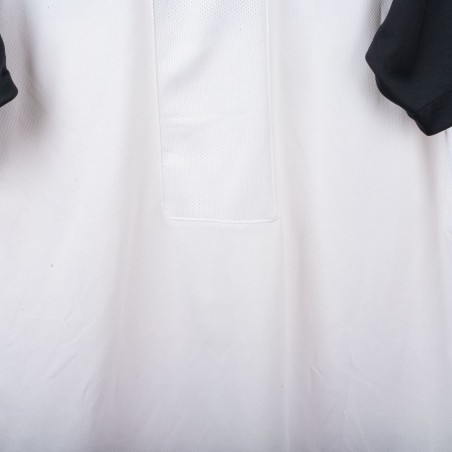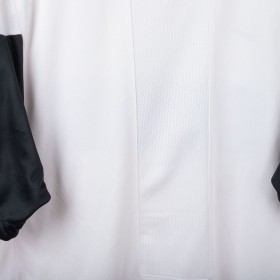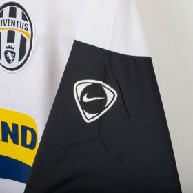 Juventus training shirt made by Nike for the 2009/2010 season. White design with black sleeves and tonal body details. "New Holland Fiat Group" sponsor printed in the centre, applied Nike logo and embroidered Juventus crest on the left chest. Nike patch with stylized logo on the sleeves. Made from NikeFit Dry technical fabric for breathability and comfort. Size L.