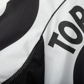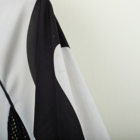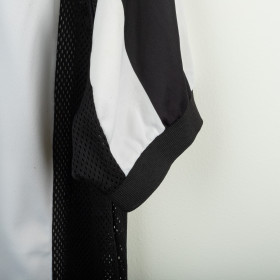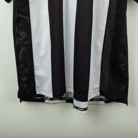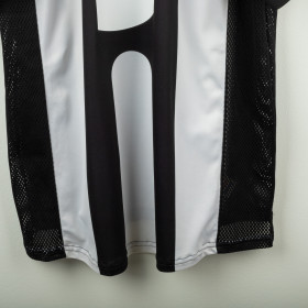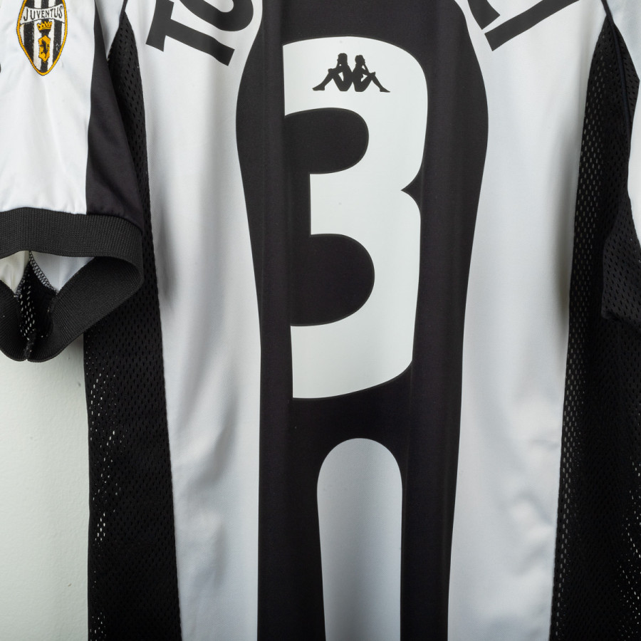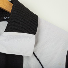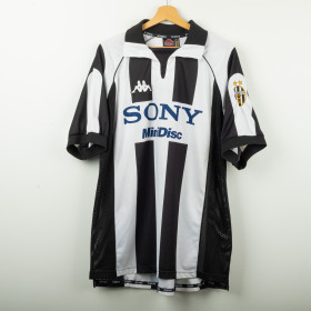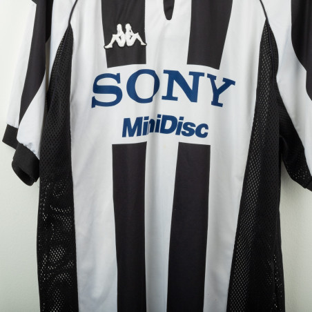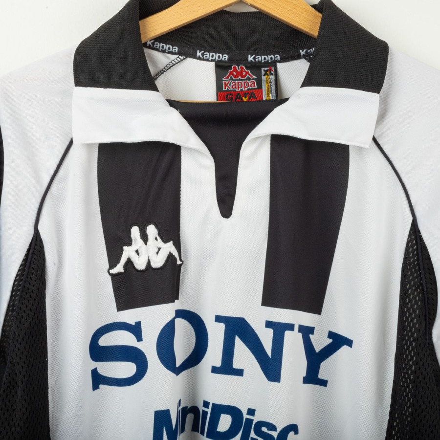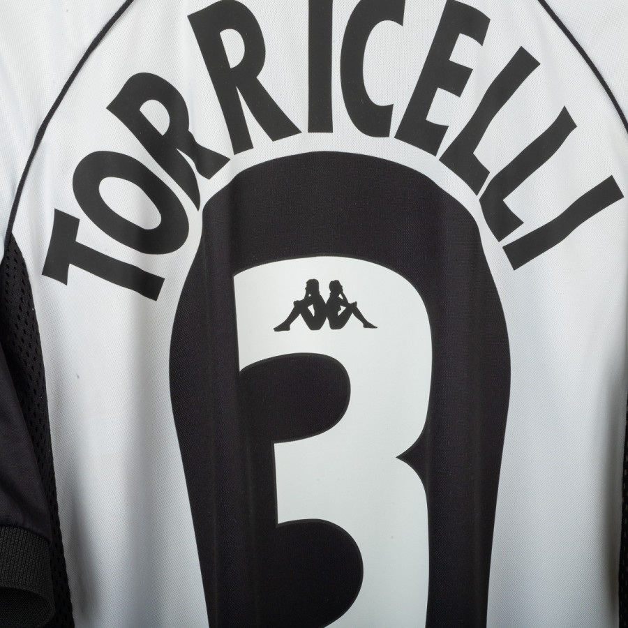 Juventus home shirt from the 1997/1998 season, made by Kappa. Classic black and white stripes with polo collar and mesh side panels. Embroidered Kappa logo on the right chest and Sony MiniDisc sponsor. Stitched Juventus patch with two stars on the left sleeve. Player name and number Torricelli 3 printed on the back in black heat-applied lettering with Kappa logo. Lightweight and breathable technical fabric. Size XL.