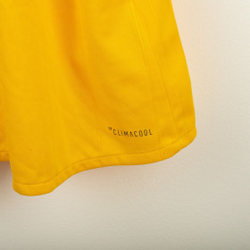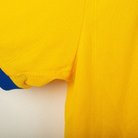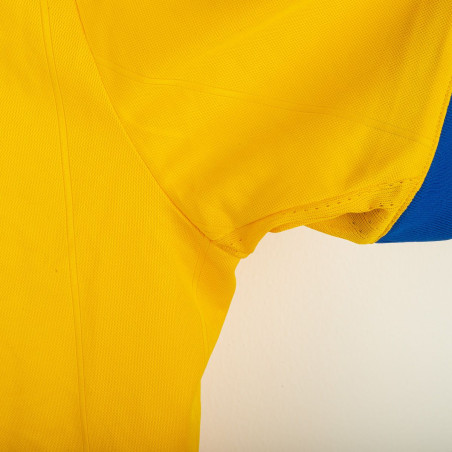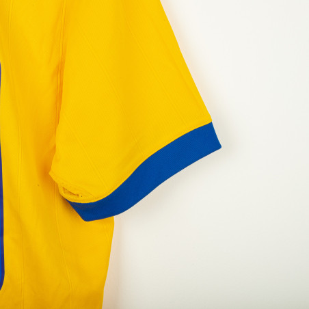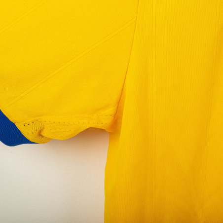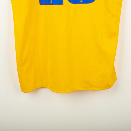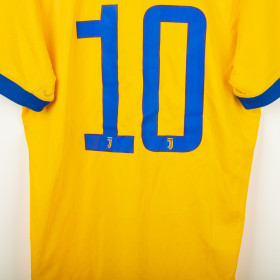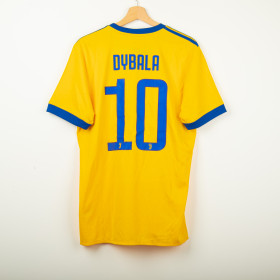 Official Juventus away shirt from the 2017/2018 season, made by Adidas and customized with Dybala 10. Yellow and blue design inspired by Turin’s colors, featuring the embroidered Juventus crest with three stars, Adidas logo, and Jeep sponsor on the front. Includes Scudetto and Coppa Italia patches. Made from ClimaCool breathable fabric for comfort and performance. An iconic shirt from Juventus’ seventh consecutive Serie A title season. Size L.