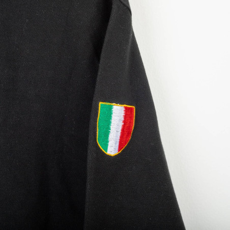 Official Juventus long sleeve polo from the 1996/1997 season by Kappa, worn during the club’s golden era with Sony sponsor. Black cotton design with three-button collar and embroidered details. Kappa and Sony logos stitched on the chest, Scudetto patch on the left sleeve, and tonal Juventus horse crest on the heart side. Kappa GAYA inner tag and “People on the Move” label. Made in Italy, size M.