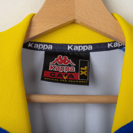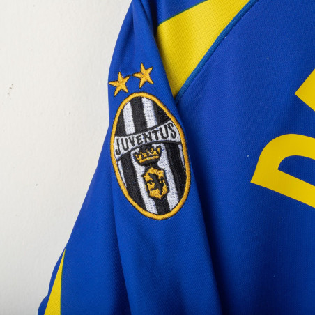Away Juventus shirt from the 1998/1999 season, iconic Kappa design in size XL. The jersey features a bold blue base with yellow accents, with the technical sponsor Kappa on the chest and sleeves, and commercial sponsor D+ Libertà Digitale front and center. On the back, the name Del Piero and number 10 are displayed in yellow. A historic piece celebrating the season where Alessandro Del Piero was a key figure. That year, Juventus won the Serie A title and reached the Champions League final, affirming their dominance in European football.