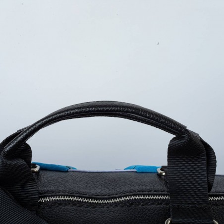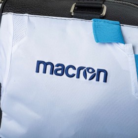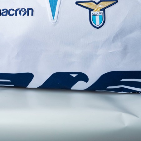 Handcrafted duffel bag made from the official Lazio 2018/2019 home jersey by Macron. White base with light blue and navy inserts, featuring the iconic eagle graphic across the lower front. Embroidered Macron logo on the right, stitched S.S. Lazio crest on the left. Black faux leather panels and back, reinforced handles and adjustable shoulder strap. A unique piece for true fans and collectors.
