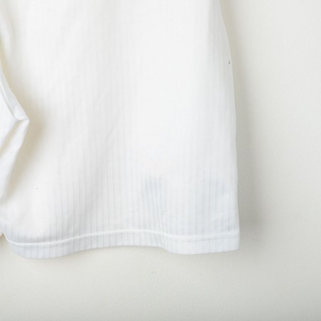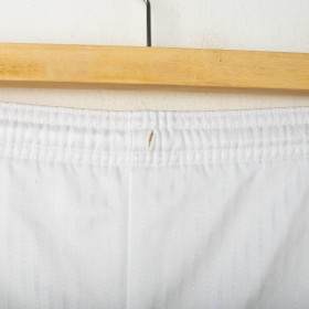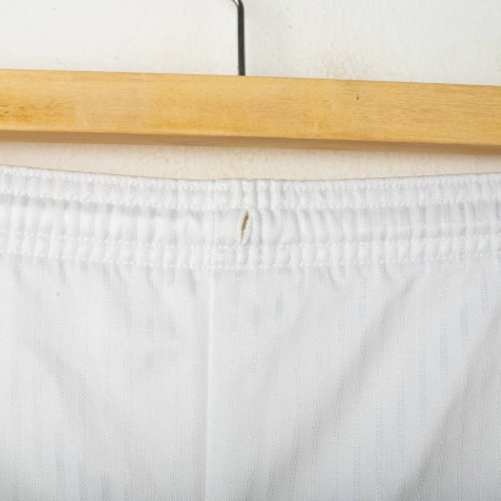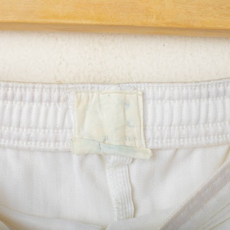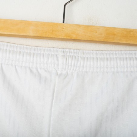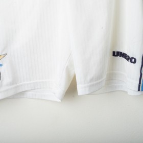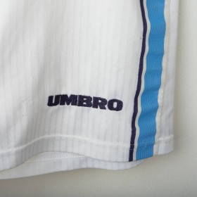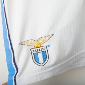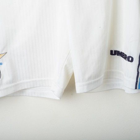 Lazio home shorts from the 1997/1998 season, made by Umbro. White with light blue side stripes edged in navy. Navy embroidered Umbro logo on the right leg, full-color embroidered Lazio crest on the left leg. Elastic waistband for a comfortable fit. Original match shorts from the transitional season between Zeman and Eriksson, with Lazio competing at the top in Serie A and UEFA Cup.