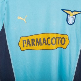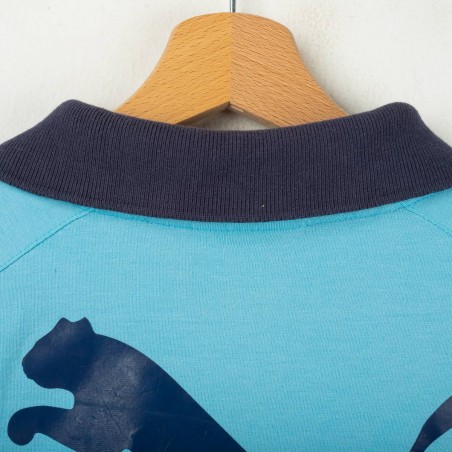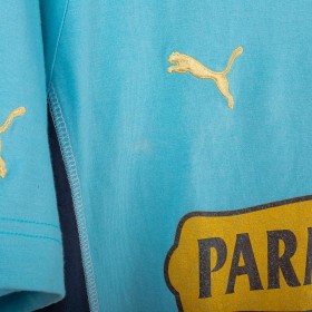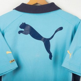 Lazio polo shirt made by Puma for the 2003/2004 season. Light blue with navy collar and side panels. Yellow embroidered Puma logos on chest and sleeves, large printed Puma logo on the back. Flock Parmacotto sponsor on the front and embroidered Lazio crest on the left chest. Size L.