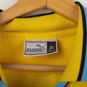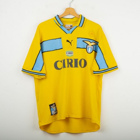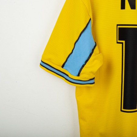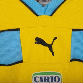 Official S.S. Lazio away shirt made by Puma for the 1998/1999 season, featuring Alessandro Nesta’s number 13 print. Yellow design with sky blue inserts and black details on collar and sleeves. Puma logo in Flock and stitched Lazio crest on the chest. Cirio sponsor printed on the front. Authentic Puma/Lazio patch on the lower hem. A classic shirt from Lazio’s golden era, just before their 2000 Serie A title.