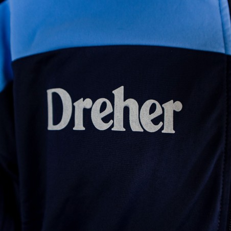 Blue jacket with light blue and yellow bands. Adidas Original logo painted in white. Sponsor Dreher and Lecce Logo are painted white.