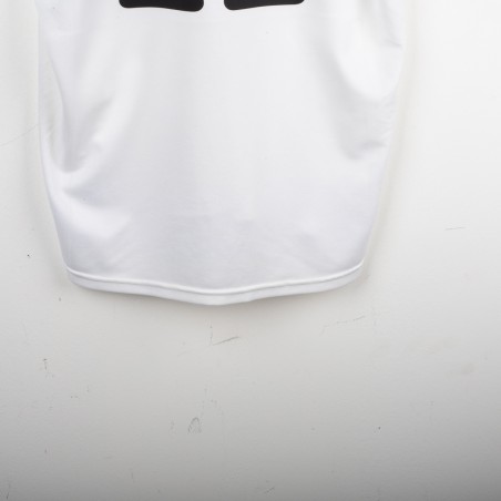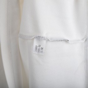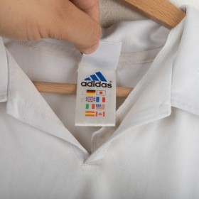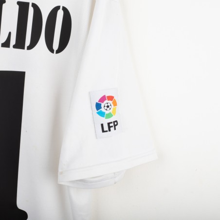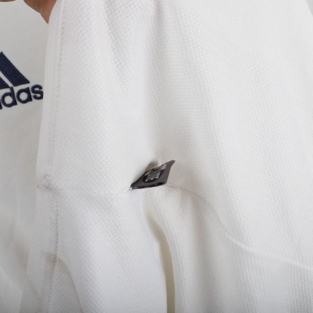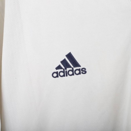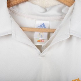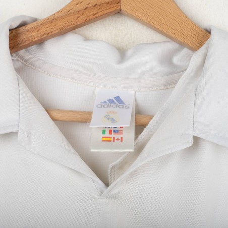 Original Real Madrid home jersey from the 2002/2003 season, made by Adidas to celebrate the club’s Centenary. White base design with embroidered Real Madrid crest on the chest and Adidas logo on the opposite side. Classic fold-over collar. Features official LFP patch on the sleeve. Ronaldo Nazário’s name and number 11 printed on the back in black. Special embroidery on the sleeve marking the Centenary (1902–2002). Size L. A historic collector’s item from the early Galácticos era.