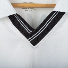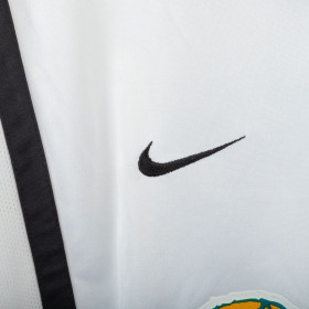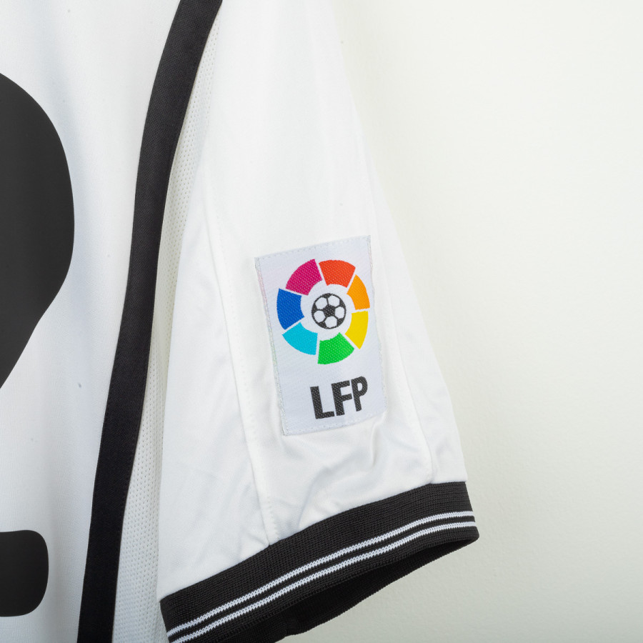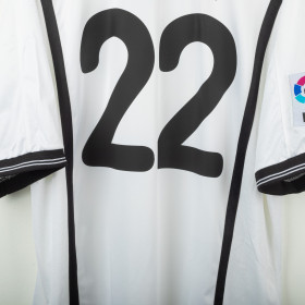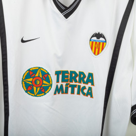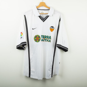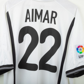 Valencia home shirt from the 2000/2001 season, made by Nike. White base with black side panels and collar details. Embroidered Nike logo on the right chest and stitched Valencia CF crest on the left. Terra Mítica sponsor. Official LFP patch on the right sleeve. Player name and number Aimar 22 printed on the back in black heat-applied lettering. Lightweight and breathable Dri-Fit fabric. Size XL.