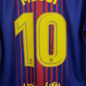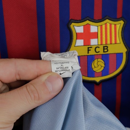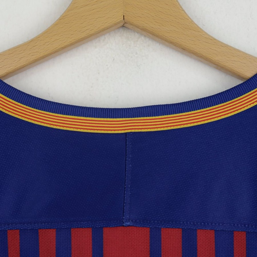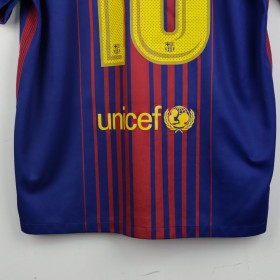 Official Barcelona Home jersey from the 2017/2018 season, customized with Lionel Messi’s name and number 10. The design features the traditional blaugrana stripes with a gradient effect in the center. The club crest is applied on the chest, along with the Nike logo and Rakuten sponsor. The UNICEF logo appears on the lower back, and the La Liga patch is on the right sleeve. Made with Dri-FIT fabric, available in XL size.