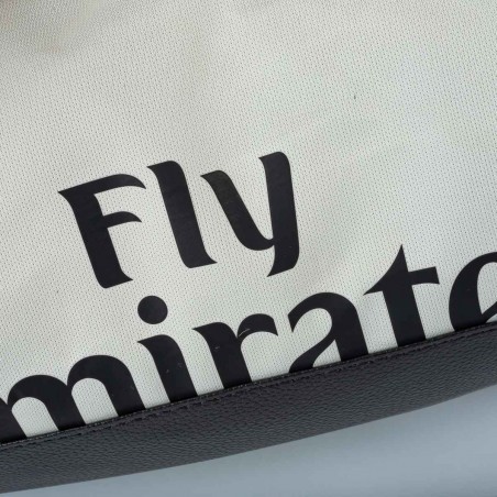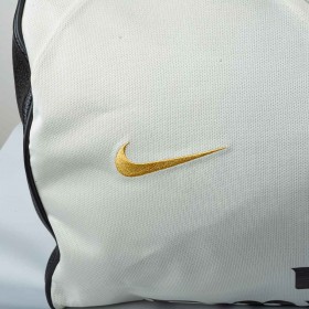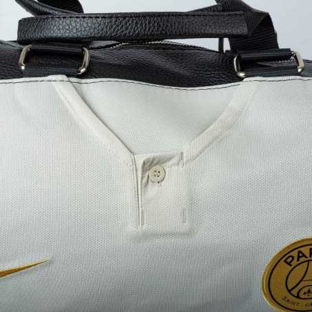 Handcrafted “Seconda Pelle” duffle bag made from the Paris Saint-Germain 2018/2019 third shirt by Nike. White base with gold details, embroidered Nike logo and golden PSG crest stitched on the chest. Handmade in Italy with black faux leather inser