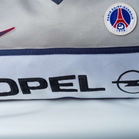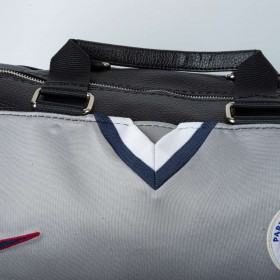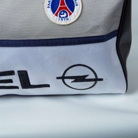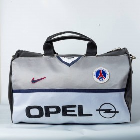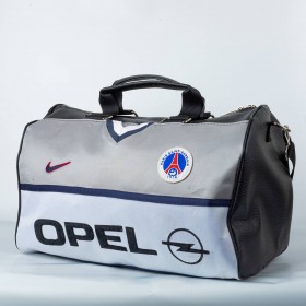 Handcrafted bag inspired by PSG’s 1999/2000 away kit. Made from synthetic leather and technical fabric, it features the iconic grey base with blue horizontal stripe, embroidered Nike logo, and stitched PSG crest. Opel sponsor printed on the front panel. Reinforced handles, adjustable shoulder strap, and solid base. A unique collector’s item for football and design lovers.