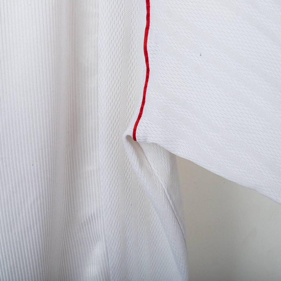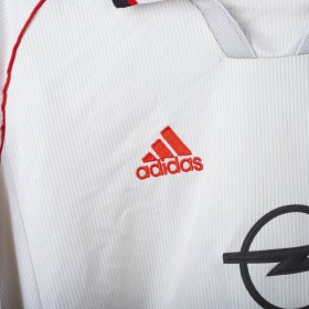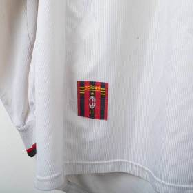 AC Milan away long-sleeve shirt with name of Paolo Maldini during the 1999/2000 season, made by Adidas. White with fine vertical pinstripes and red/black details on collar and cuffs. Red Adidas three stripes along the sleeves. Embroidered red Adidas logo on the right chest, stitched Milan crest with gold star above on the left. Opel sponsor in black flock on the front. “Maldini” name and number 3 in black with red outline on the back. Official Adidas “Official Garment” label stitched on the hem. Regular fit.