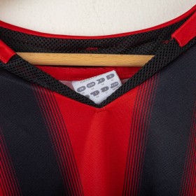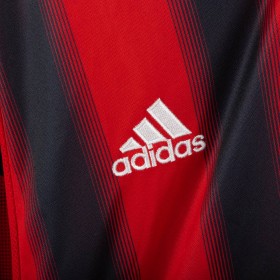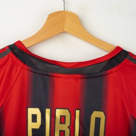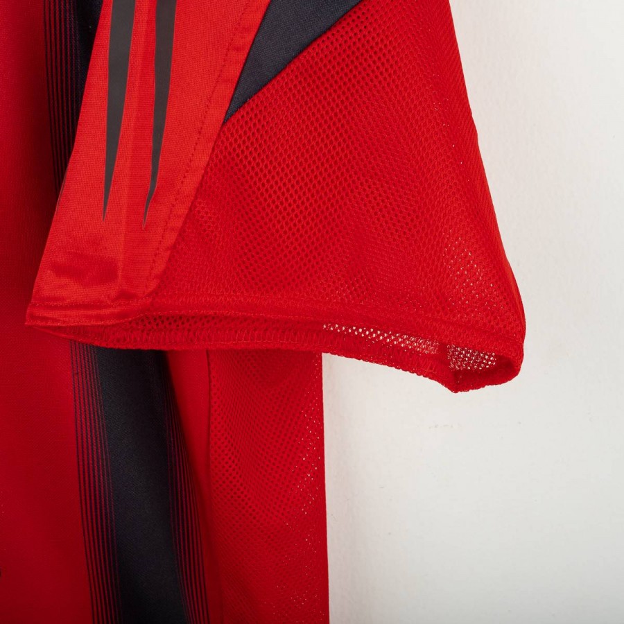 AC Milan home jersey made by Adidas for the 2004/2005 season, customized with Andrea Pirlo’s name and number 21. Classic red and black stripes with subtle gradient details on the sides, red accents on collar and sleeves. Embroidered Adidas logo on the chest, printed Opel sponsor on the front and embroidered AC Milan crest with gold star above on the left chest. On the back, “PIRLO” name set and number 21 in gold with black trim. Size M.