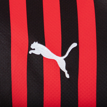 The product can be clearly seen from the many photos relating to it. The shirt has short sleeves and its main colors are the red background and the black of the numerous narrow vertical stripes that cross it; the club logo is applied to the top left, while on the opposite side there is the white one of Puma, technical sponsor; the commercial sponsor, Fly Emirates, is also applied below these elements, also in white.