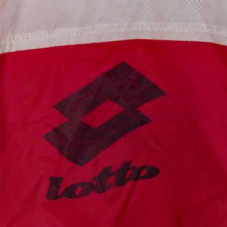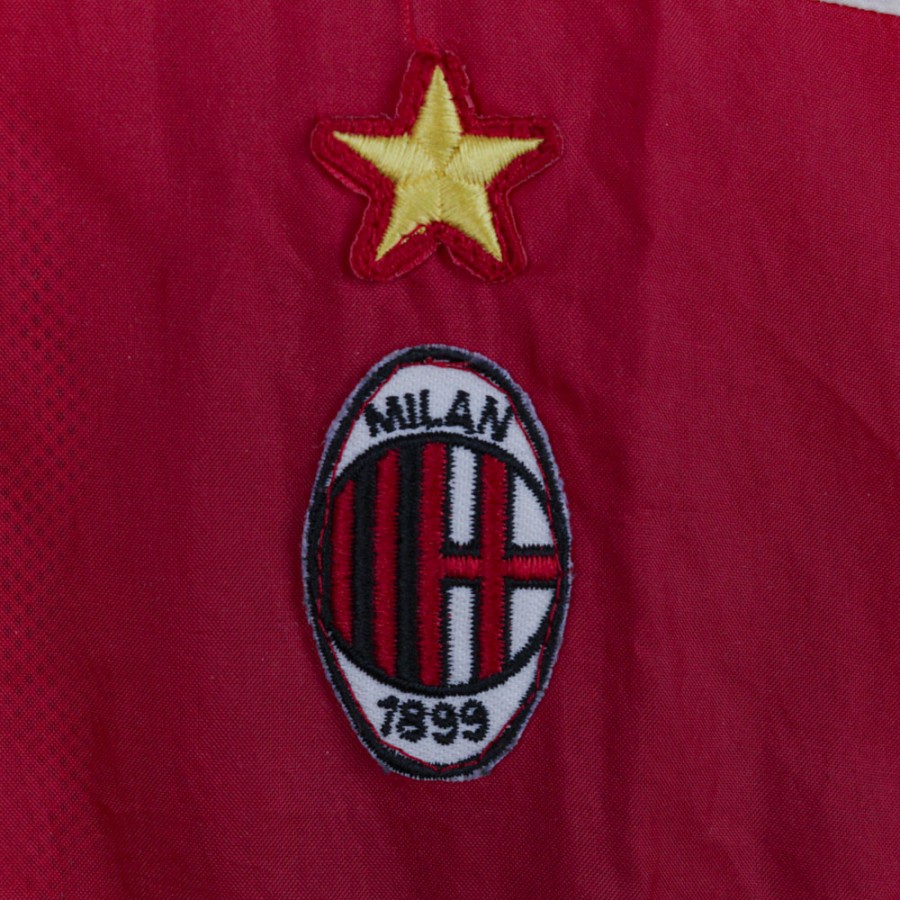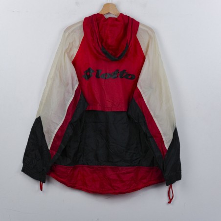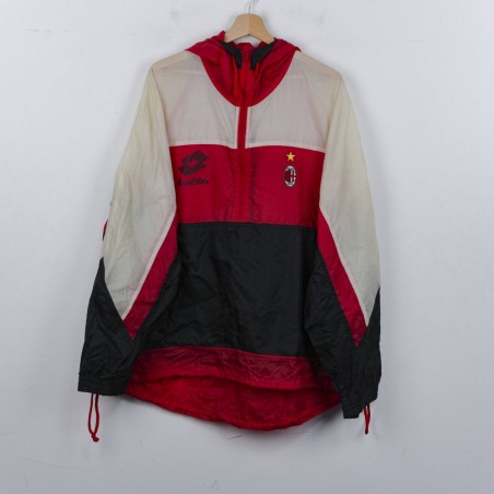 Official AC Milan jacket from the 1994/1995 season, produced by technical sponsor Lotto. This jacket features an iconic design with the club's red, black, and white colors. On the chest, the Lotto logo and the Milan crest with a golden star, representing their numerous league titles, are prominently displayed. The back showcases the black Lotto logo, and the jacket includes a hood and half-zip closure. A classic piece from the mid-1990s, a successful era for the club.