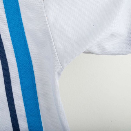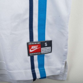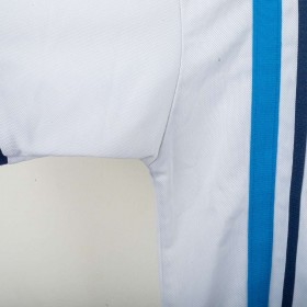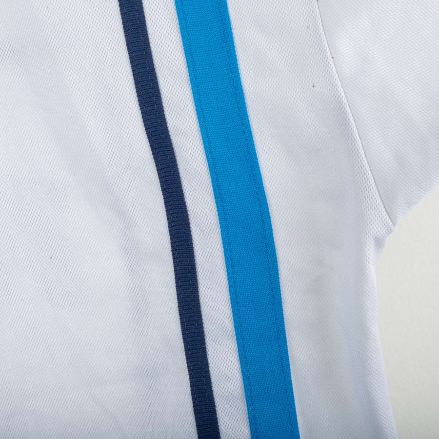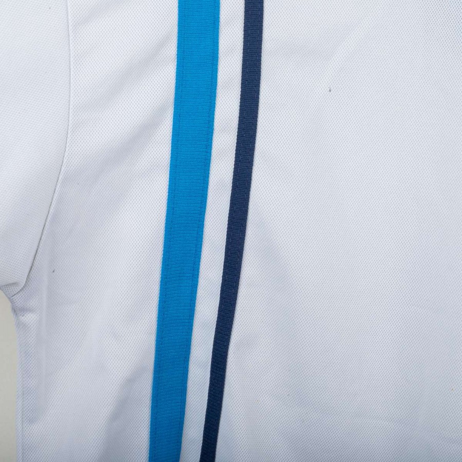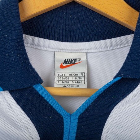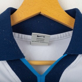 Napoli away shirt from the 1997/1998 season, made by Nike. White with double vertical light blue and navy stripes on both front and back. Navy collar and sleeve cuffs with light blue trim. Embroidered navy Nike logo with light blue outline on the right chest, stitched SSC Napoli crest on the left. “Polenghi” sponsor in light blue rubber print on the front. Regular fit. Size S.