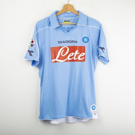 Napoli home shirt from the 2008/2009 season, made by Diadora. Light blue base with white inserts. Diadora logo embroidered on the chest. Central Lete sponsor in sublimated print. SSC Napoli crest stitched on the left chest. Serie A Lega Calcio patch applied on the sleeve. Back with Grava name and number 2 in white print. Regular fit. Size M.
