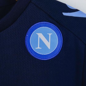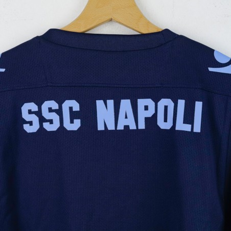 SSC Napoli Macron training shirt n13 from the 2013/2014 UEFA season. Official navy blue model with sky blue details, embroidered Macron logo and applied SSC Napoli crest. Features SSC Napoli lettering on the back and number 13 printed on the front. Made of lightweight breathable fabric, perfect for training sessions and vintage football collections.