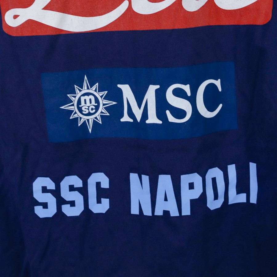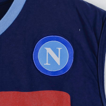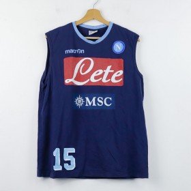 SSC Napoli Macron official training tank top from the 2013/2014 season. Navy blue with light blue collar details. Features Lete and MSC sponsors, Macron logo, and SSC Napoli crest. Number 15 printed on the front. Sponsors and SSC Napoli lettering on the back. Size XL.