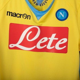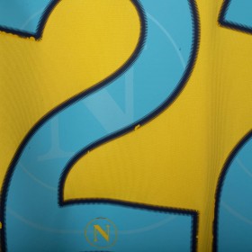 Official third Napoli shirt from the 2011/2012 season, made by Macron. The jersey features a striking yellow and sky blue colorway, with black inserts on the shoulders and contrasting blue details on collar and sleeve cuffs. The front displays the Macron logo, SSC Napoli crest and Lete sponsor. On the back is the name and number “Lavezzi 22”, paying tribute to the Argentine star. Inside the collar, the motivational quote “Work Hard. Play Harder.” is printed. Size M (EU), in excellent condition.