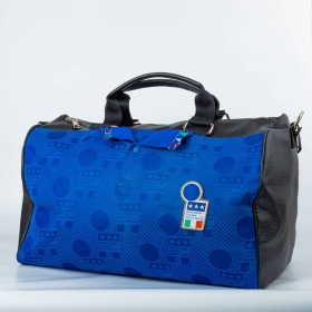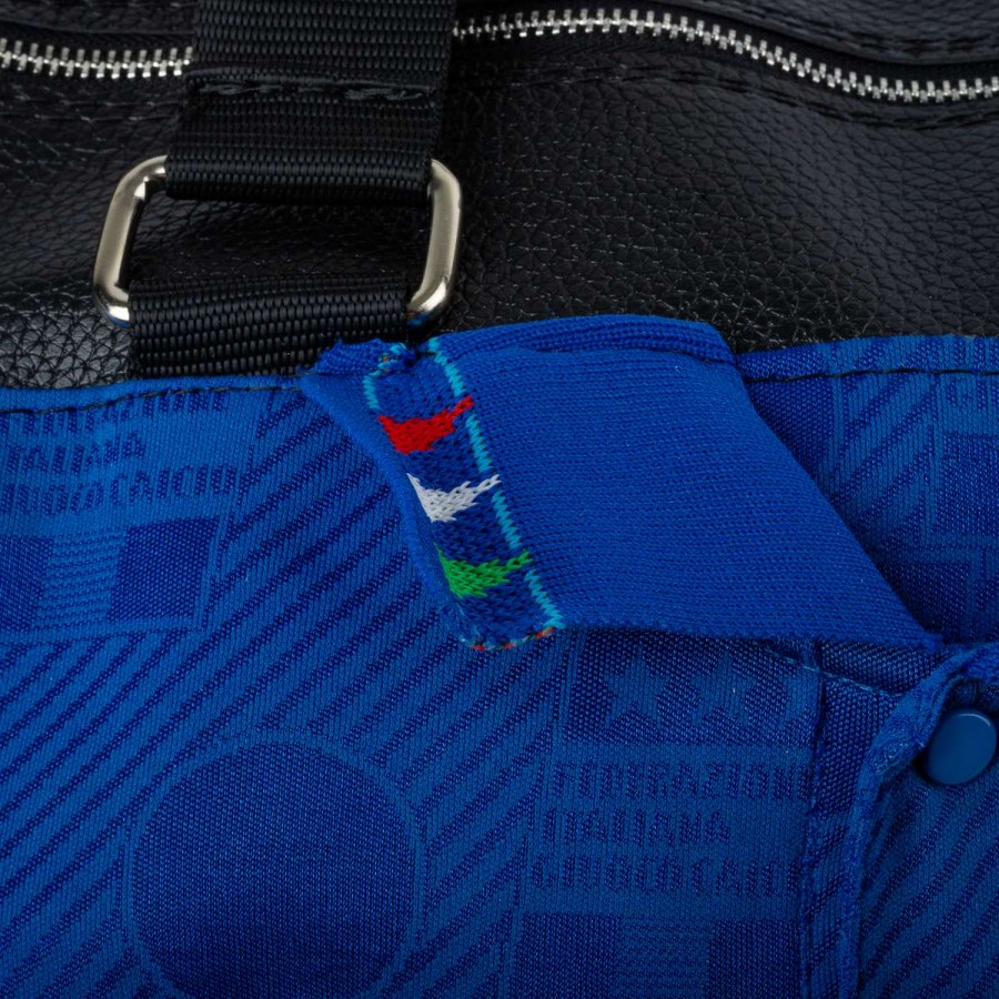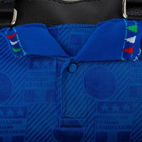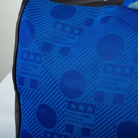 Handmade duffel bag crafted from the original Italy 1994 Diadora jersey. Iconic azzurro with jacquard pattern and tricolour collar details. Embroidered FIGC crest with three stars on the chest. Faux leather back, adjustable shoulder strap and reinforced handles. A unique, handcrafted piece made in Italy from an authentic vintage shirt.