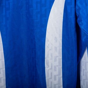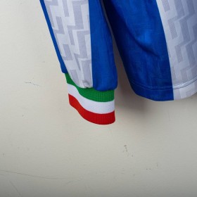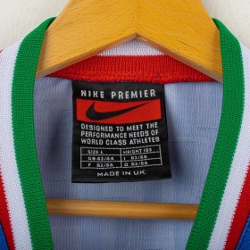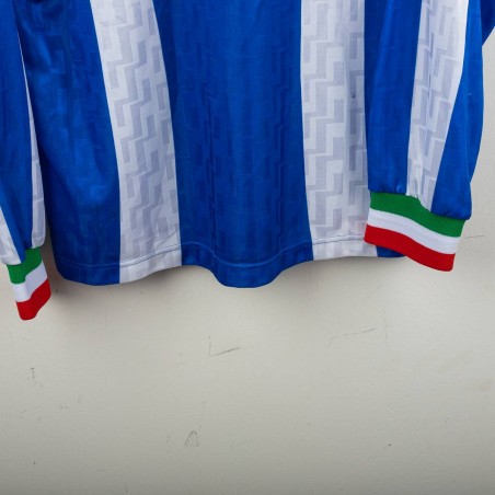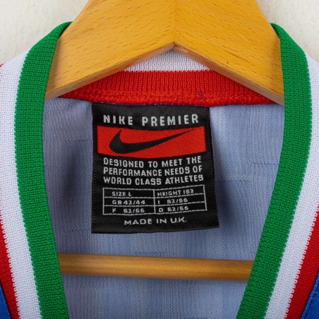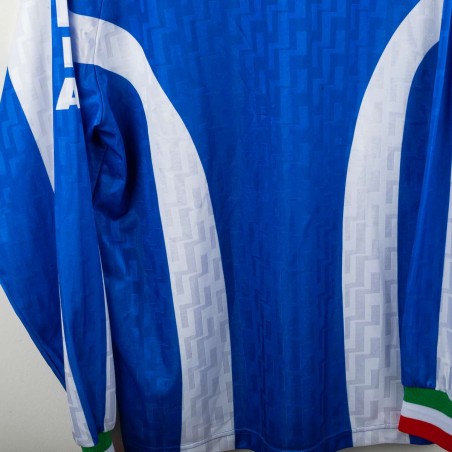 Official Italy national team training shirt from 1996, made by Nike. Long sleeve model, blue base with white inserts and tricolour details on collar and cuffs.