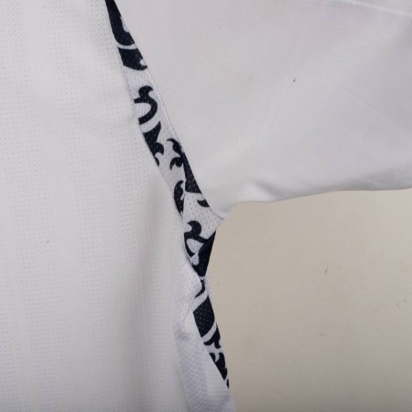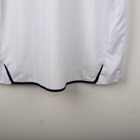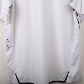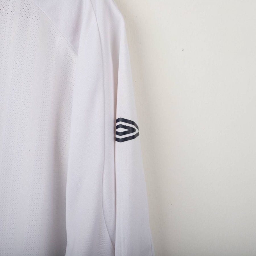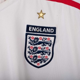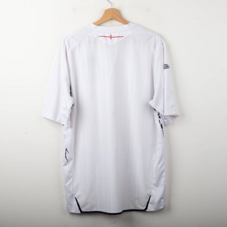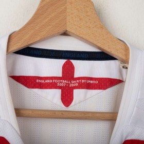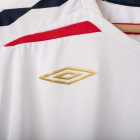 England Home shirt used between 2007 and 2009, made by Umbro. White with red and navy inserts on shoulders and sides. Gold embroidered Umbro logo on the right chest, full-colour England crest with gold star stitched on the left chest. Red St. George's Cross print inside the collar and on the back. Regular fit, short sleeves, breathable technical fabric. Size XXL.
