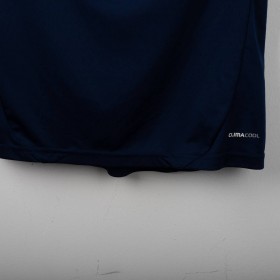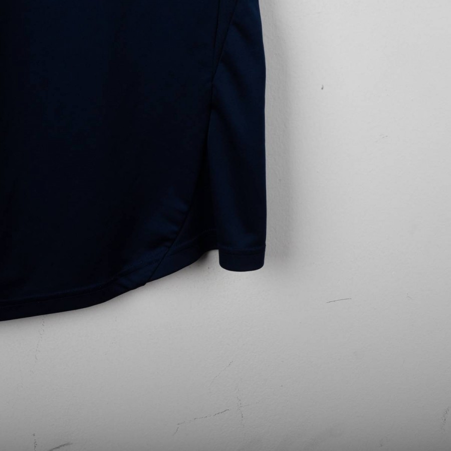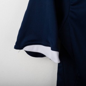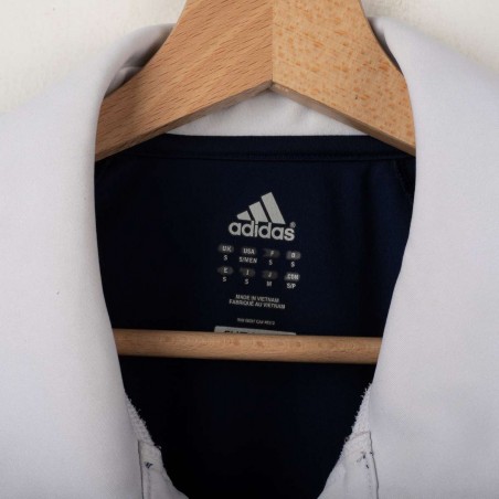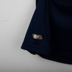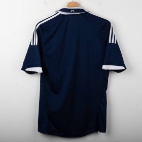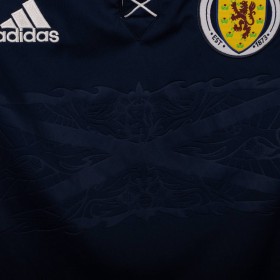 Scotland national team home shirt from the 2012/2013 season, made by Adidas. Navy blue with white details on the collar and sleeves, three white Adidas stripes on the shoulders. White embroidered Adidas logo on the right chest and embroidered Scotland crest on the left chest. Tone-on-tone dragon motif on the front. Climacool technology for optimal breathability. Polo collar with button closure. Regular fit. Size S.