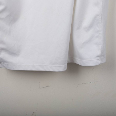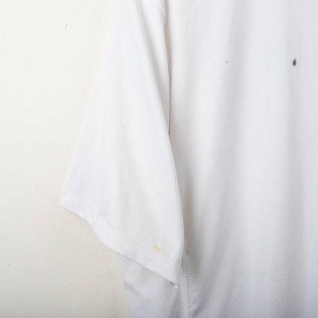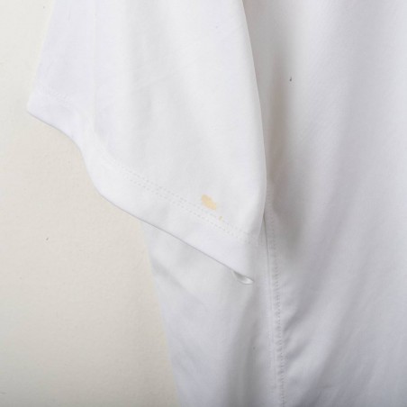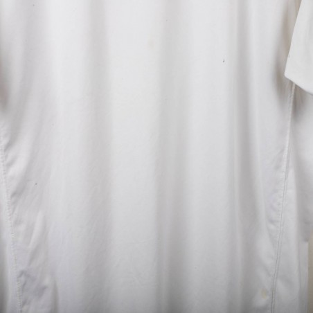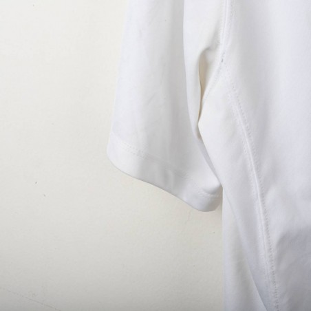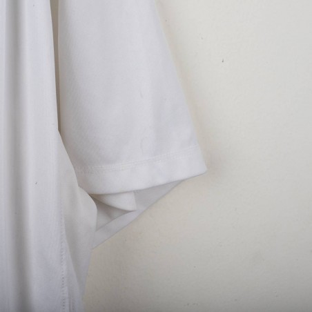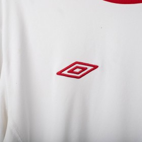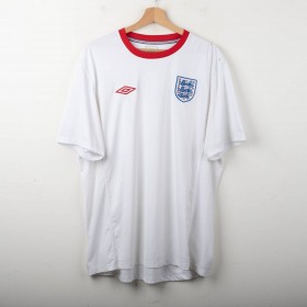 England training shirt from the 2010 season, made by Umbro. White with a red crew neck and subtle blue and white inner detailing. Red embroidered Umbro logo on the right chest, stitched England crest with three blue lions on the left. Regular fit. Size XXL.