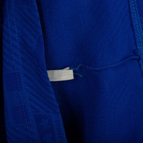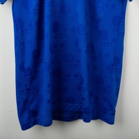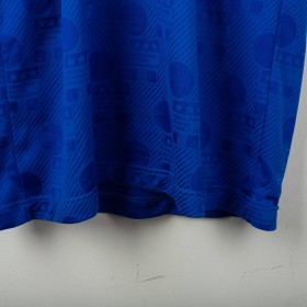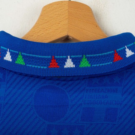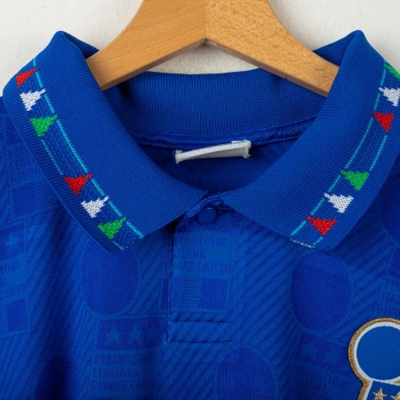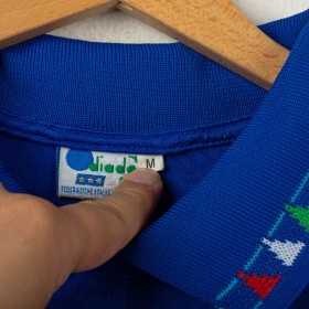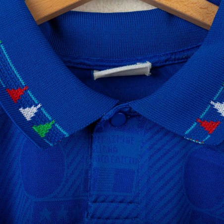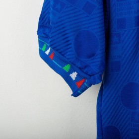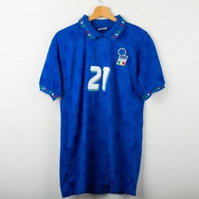 Official Italy home shirt from the USA 1994 World Cup, made by Diadora. Azzurri blue with tonal FIGC jacquard pattern and tricolour details on collar and sleeves. Embroidered FIGC crest on the left chest, Zola name set and number 21 in white flock with grey and blue outline. Polo collar with two-button closure. Size M.