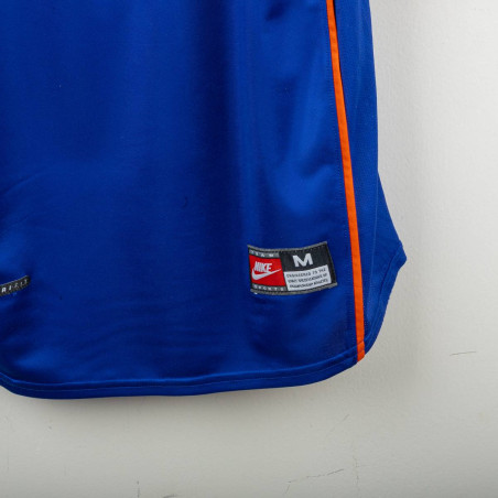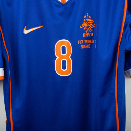 Netherlands away jersey made by Nike for the 1998 FIFA World Cup in France, customized with Bergkamp’s name and number 8. Short-sleeve design in blue with orange and white details on collar and cuffs. Embroidered Nike logo on the right chest and KNVB crest with "FIFA World Cup France 98" text on the left chest. On the back, “BERGKAMP” name set and number 8 in orange. Regular fit. Size M.