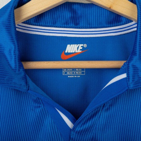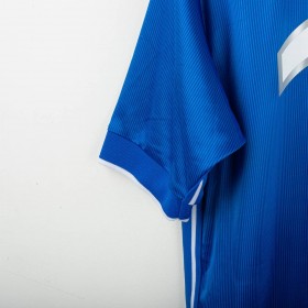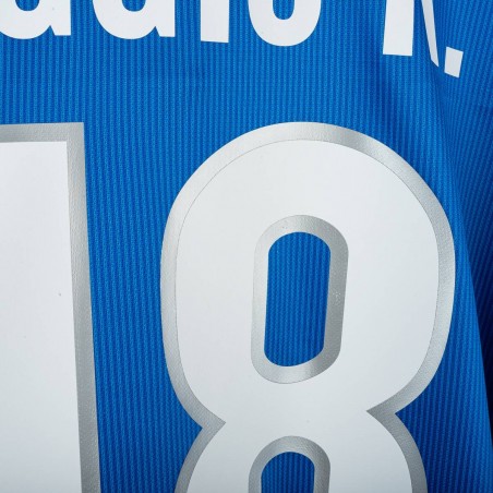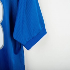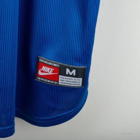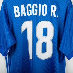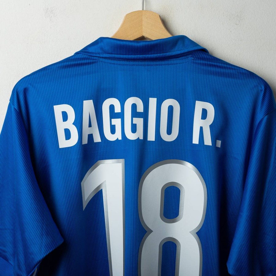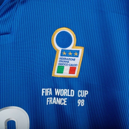 Italy home jersey made by Nike for the 1998 FIFA World Cup in France, customized with Roberto Baggio’s name and number 18. Short-sleeve design in blue with white details on the collar and sleeve edges. Embroidered Nike logo on the right chest and FIGC crest with three stars on the left chest, alongside “FIFA World Cup France 98” text. On the back, white name set “BAGGIO R.” and number 18. Regular fit. Size M.