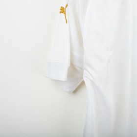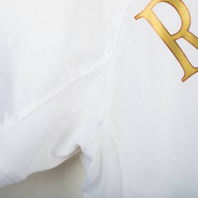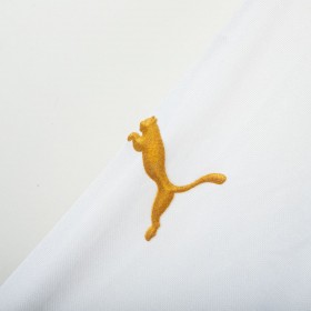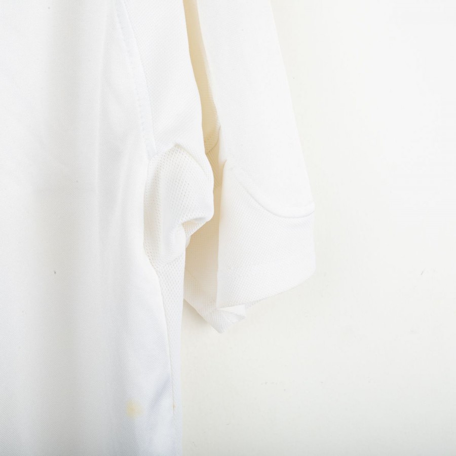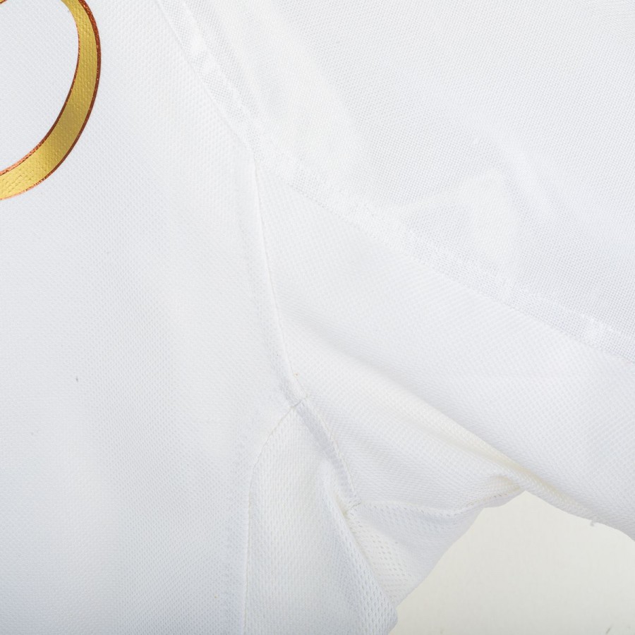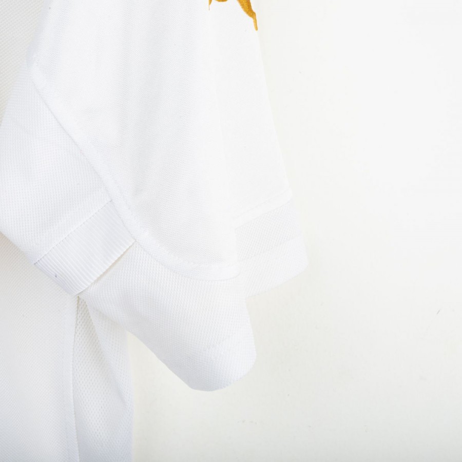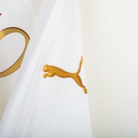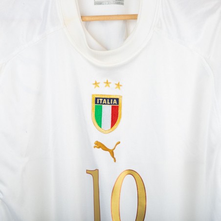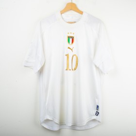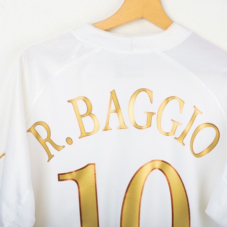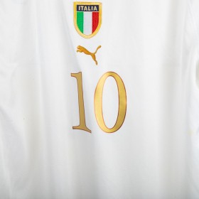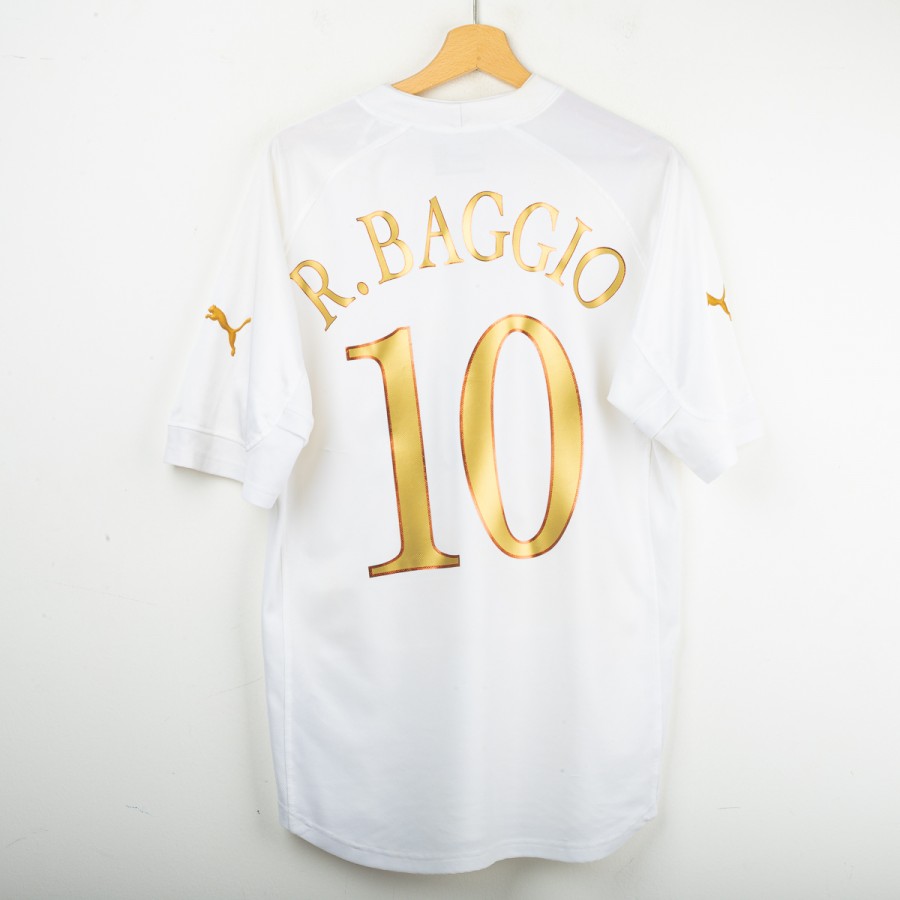 Italy away shirt from 2004, made by Puma. White base with gold details. Puma logo embroidered on the chest. FIGC crest stitched on the left chest with three stars above. Gold number 10 printed on the front. Back with R. Baggio name and number 10 in gold print. Sleeves feature embroidered Puma logos. Regular fit. Size XL.
