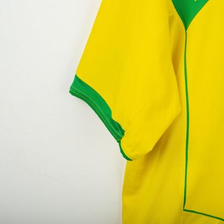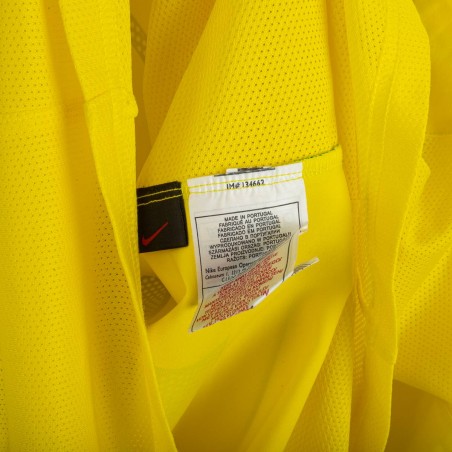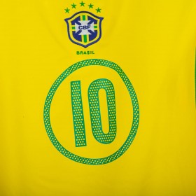 Official Brazil national team home shirt made by Nike for the 2004/2005 season, featuring Ronaldinho’s number 10 print. Classic yellow design with green inserts on the collar and sleeves. Embroidered CBF crest with 5 stars at the center of the chest, Nike logo stitched in green on the right side. Stylized number 10 printed on the front and back. Made with Nike Sphere Dry technology for comfort and breathability. An iconic jersey representing Brazil’s 2000s golden era and the brilliance of Ronaldinho.
