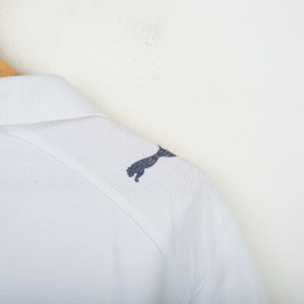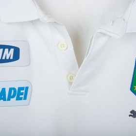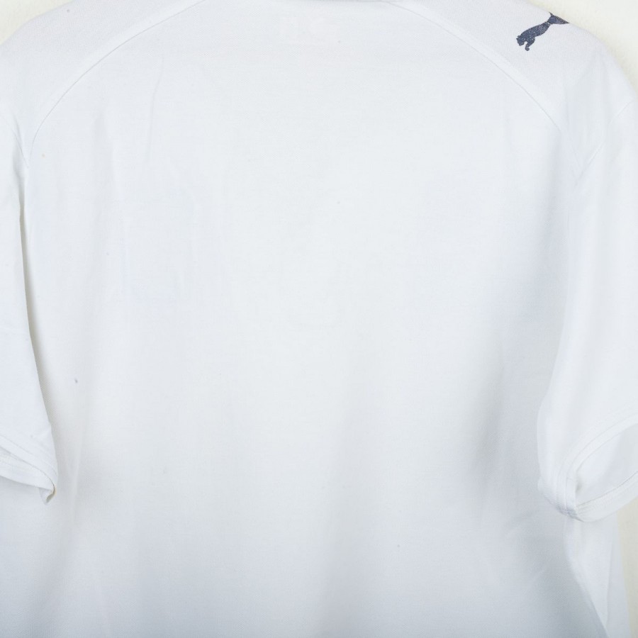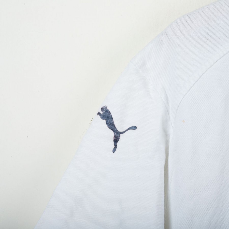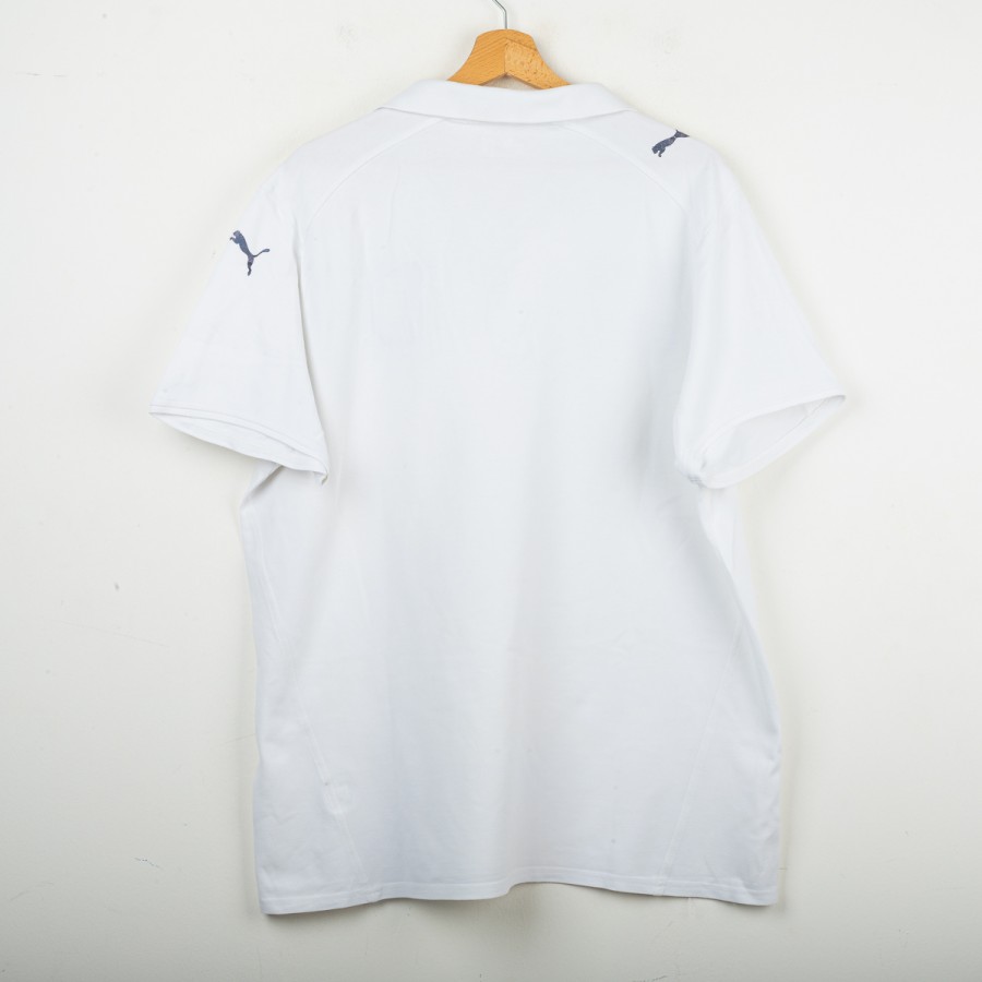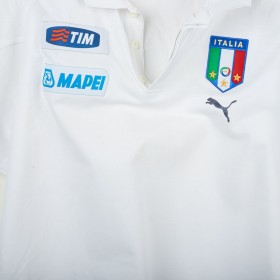Official Italy National Team polo made by Puma for the 2010/2011 season. White design with classic collar and buttons. Embroidered Puma logo on the right chest, colorful FIGC crest with three golden stars on the left chest. Tim and Mapei sponsors printed on the front. Made of breathable cotton, this polo was worn by staff and players during off-pitch events and representation. Size XL. A must-have for Azzurri fans and collectors of FIGC apparel.