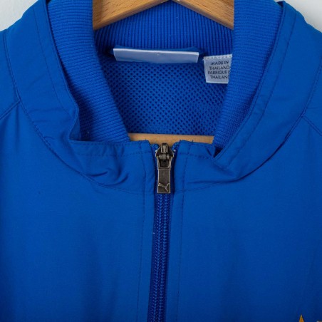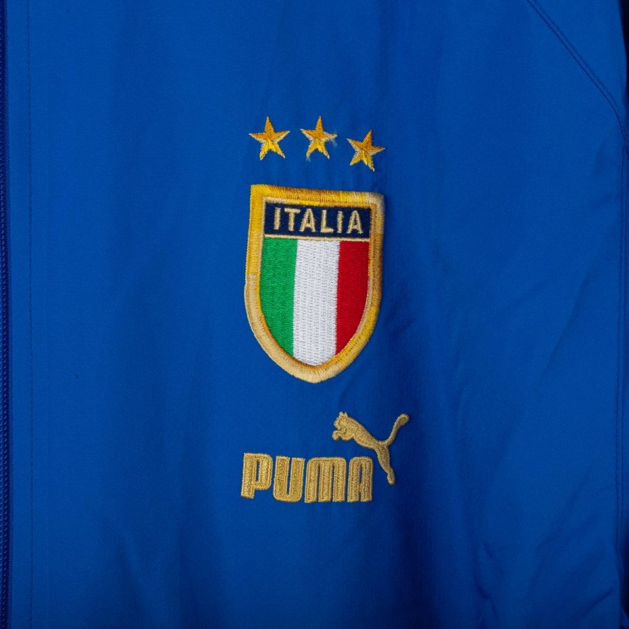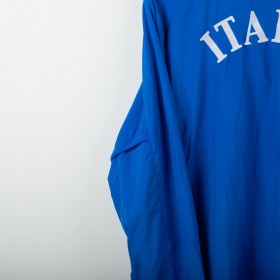 Official Puma jacket of the Italian National Team, season 2004. Light blue model with full zip, FIGC crest with three stars stitched on the left chest and gold Puma logo. TIM sponsor patch on the chest. “ITALIA” embroidered on the back. Mandarin collar, elastic cuffs and hem. Loose and comfortable fit, designed as a representation garment. A rare vintage piece from the years leading to the 2006 World Cup.