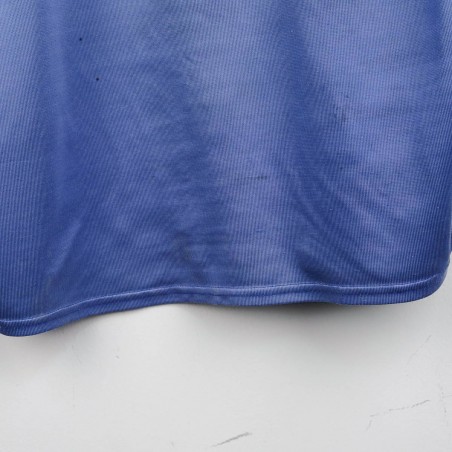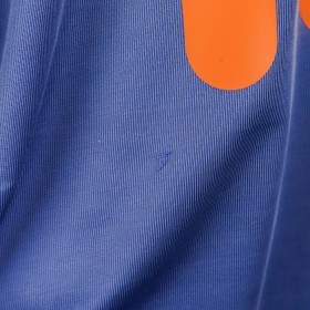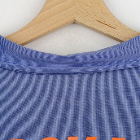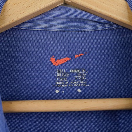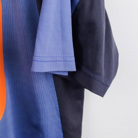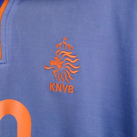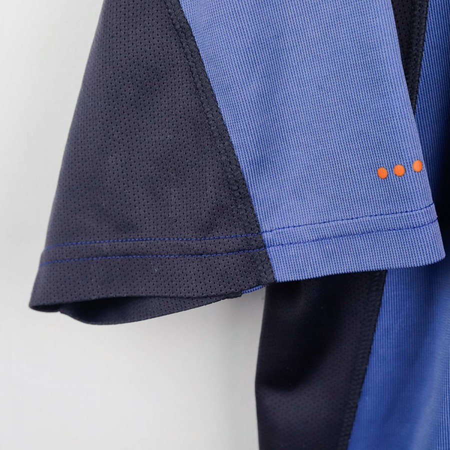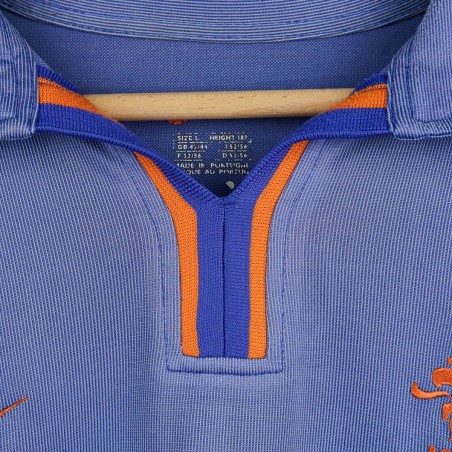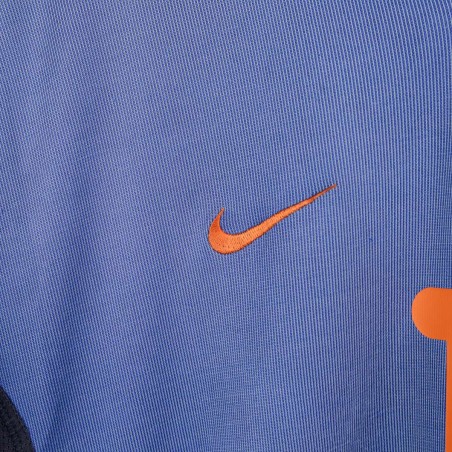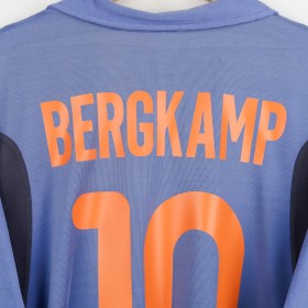 Official Netherlands home shirt from the 2000 season, produced by Nike and personalized with the name and number of Dennis Bergkamp, the legendary number 10. The design features a blue base with orange details, a classic collar, and dark side panels. The KNVB crest is applied on the left chest, while the Nike logo is embroidered on the right side. On the back, “Bergkamp” and the number 10 are printed in bold orange.