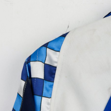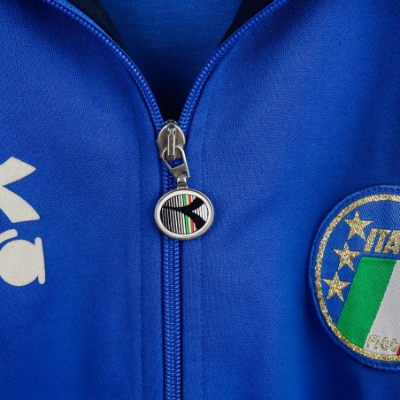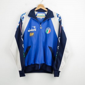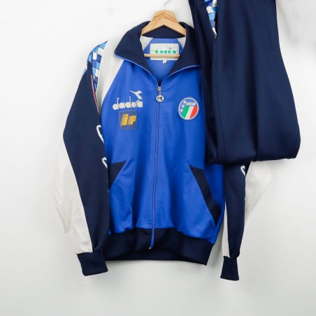 1990 Italy Tracksuit Diadora IP. This tracksuit is one of the most iconic kits worn by the Italian national team, created by Diadora for the 1990 World Cup hosted in Italy. The jacket features a bold blue design with white and navy inserts, checkerboard sleeve details, and embroidered logos of Diadora, sponsor IP, and the FIGC crest. The matching pants maintain a sleek and classic silhouette.