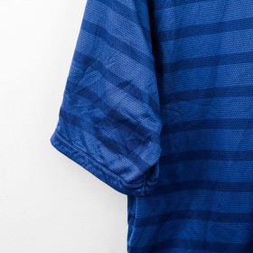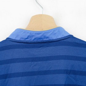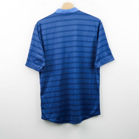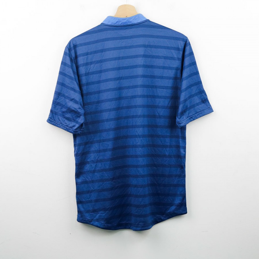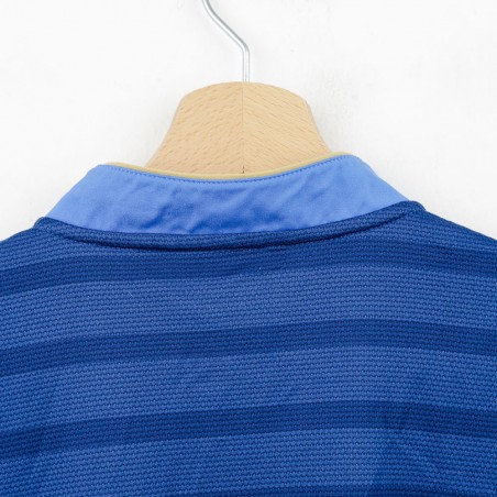 Official France national team home shirt for the 2012/2013 season, produced by Nike in size M. The design features elegant tone-on-tone horizontal stripes, a mandarin collar, and the iconic French tricolour detailing inside. The front displays the Nike swoosh and the Fédération Française de Football crest with a gold star.