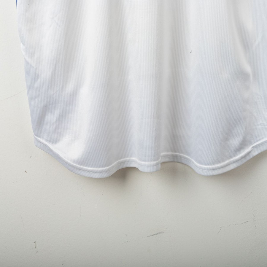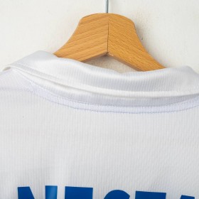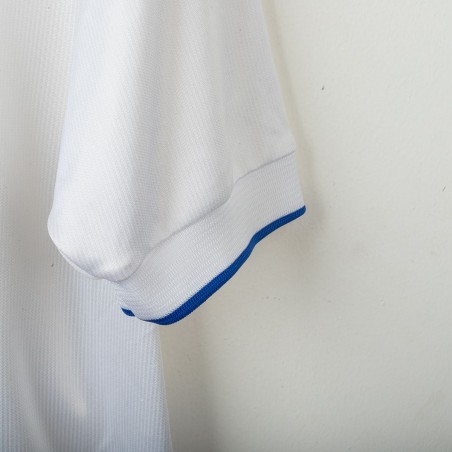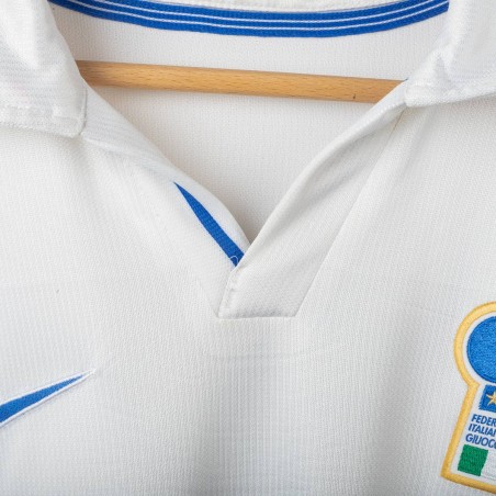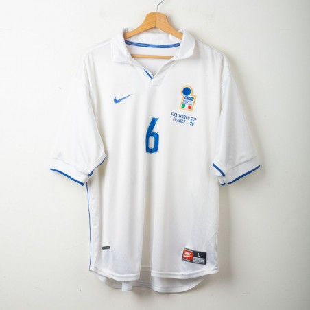 1998 Away Italy shirt by Nike featuring Alessandro Nesta’s name and number 6 on the back, size L. The design includes a white base with blue accents, polo-style collar, and the official France ’98 World Cup patch on the chest. The Nike logo is present both on the front and the inner tag. A little fact: this World Cup marked Nesta’s first appearance in the tournament, although it ended early due to an injury against Austria in the round of 16.
