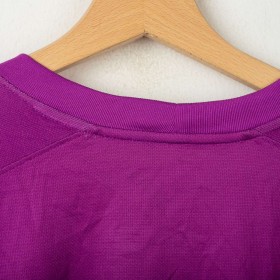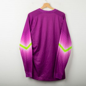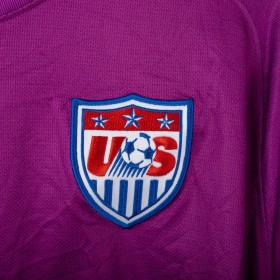 USA national team goalkeeper shirt made by Nike for the 2014/2015 season. Features a vibrant purple colorway with pink gradients and neon green sleeve details. The USA crest appears on the chest alongside the Nike technical sponsor. Made with breathable Dri-FIT fabric. Heat applied label. Size XL