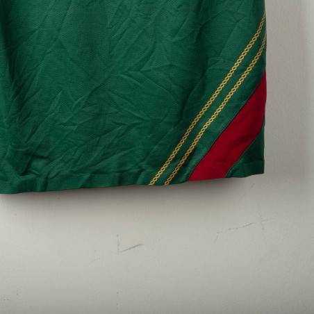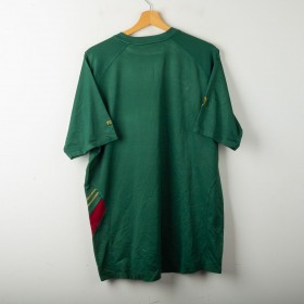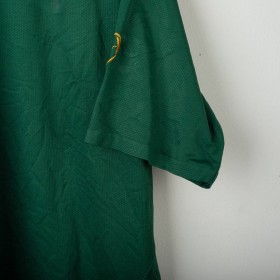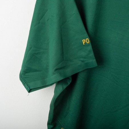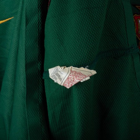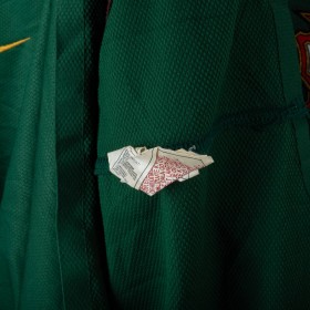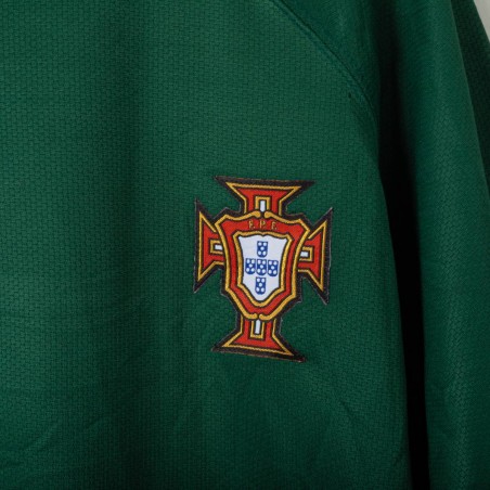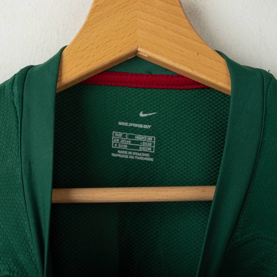 Official Portugal national team training shirt for the 2006/2007 season, made by Nike. This model features a dark green base with yellow-gold accents and red inserts at the hem. The Nike logo is stitched next to the Portuguese Football Federation (FPF) crest, and the sleeve is embroidered with the word “PORTUGAL” and the Sphere Dry logo. Made with Nike’s Sphere Dry technical fabric for optimal breathability during training. Size L.