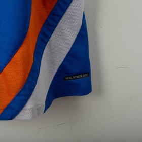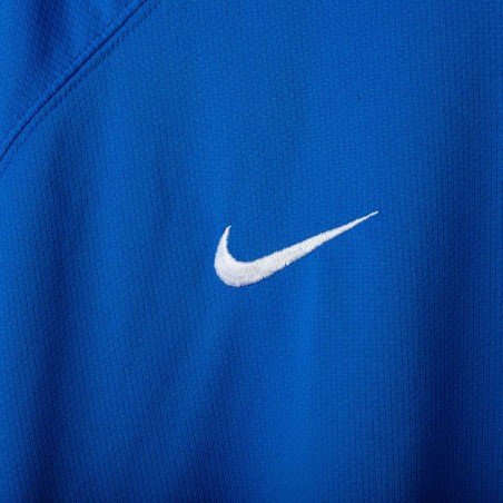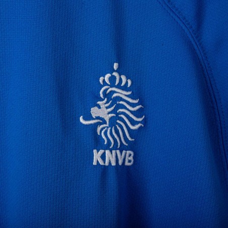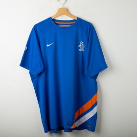 Training shirt of the Netherlands national team from 2006, made by Nike. Royal blue color with white and orange details on the side. Embroidered Nike logo on the right chest and stitched KNVB crest on the left. Features Nike Sphere Dry tech printed inside the collar. Loose fit, size XXL. Original vintage training shirt from the 2000s.