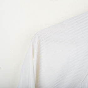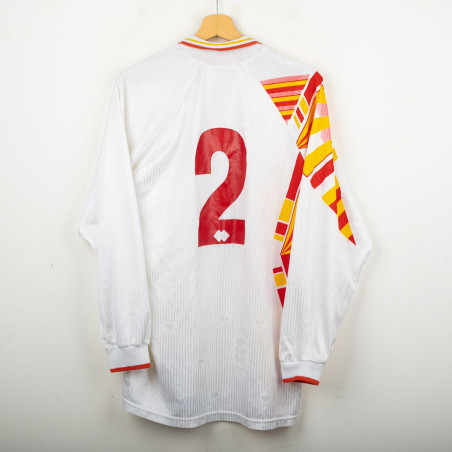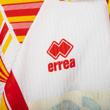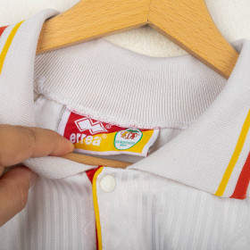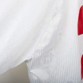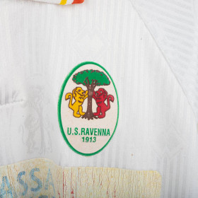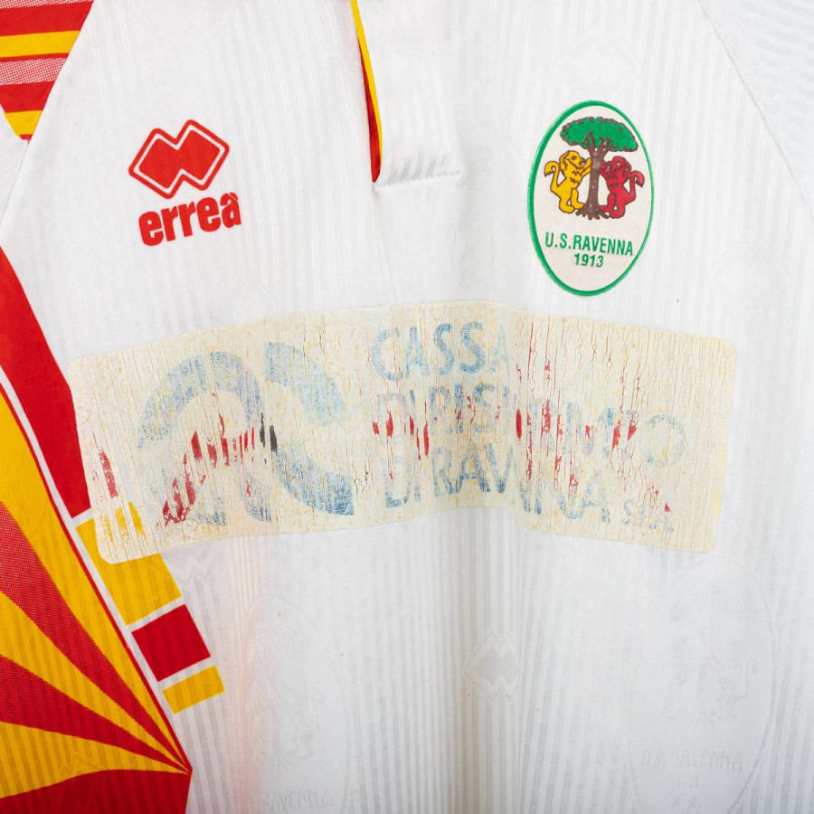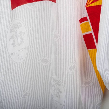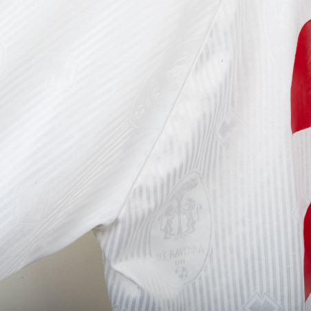 Official Ravenna away shirt from the 1995/1996 season, made by Erreà. White design with tonal sublimated graphics and red/yellow geometric inserts on the right shoulder and sleeve. Red embroidered Erreà logo on the chest, stitched club crest on the left chest, and Cassa Risparmio Ravenna sponsor printed on the front (worn). Red flock number 2 on the back. Polo collar with red and yellow details, ribbed cuffs. Long-sleeve model, made of lightweight and breathable polyester. Size XL.