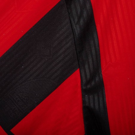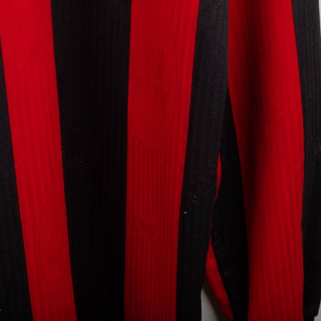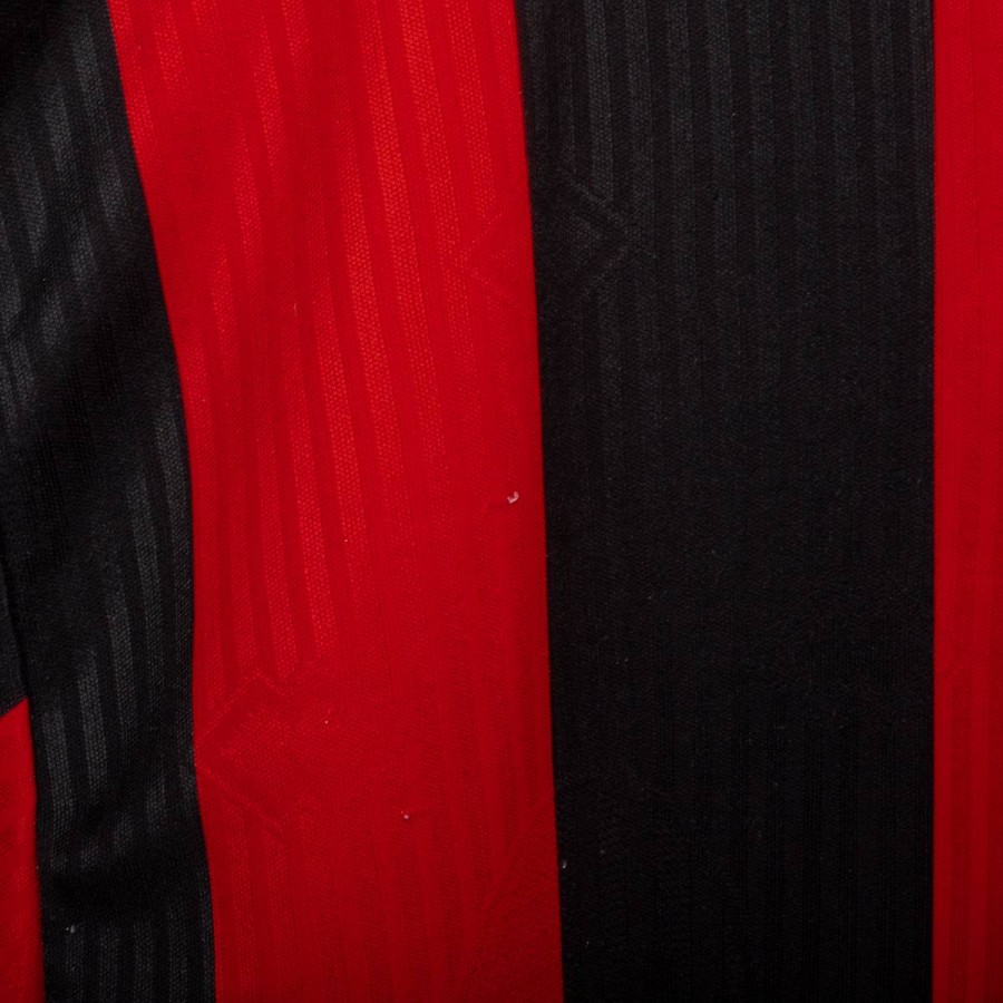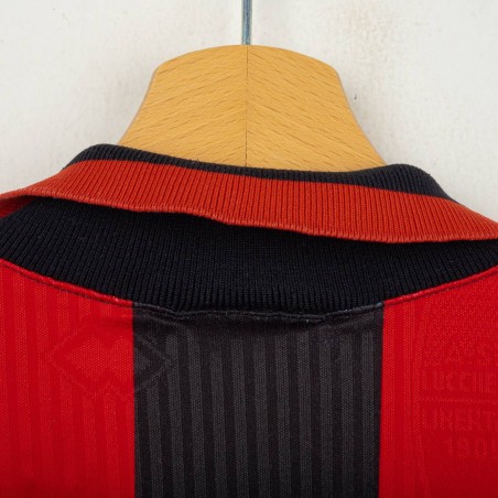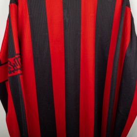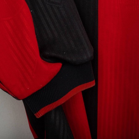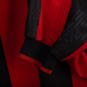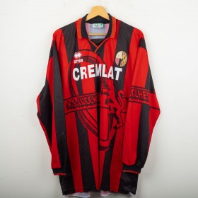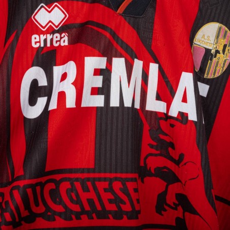 Official Lucchese home shirt from the 1996/1997 season, made by Erreà. Red and black vertical stripes with custom jacquard pattern and large sublimated club crest on the front. Applied Erreà logo, printed front sponsor “CREMLAT”. Lucchese club badge stitched on the left chest. Black collar with red details, V-neck closure. Long sleeves with elastic cuffs. Size XXL.