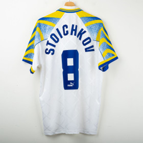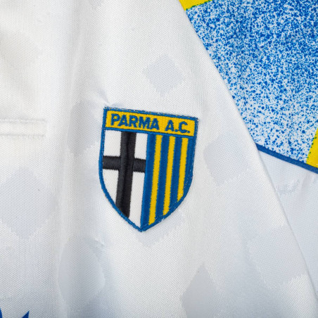 Parma home shirt from the 1995/1996 season, made by Puma. White base with yellow and blue details on the sleeves. Central Parmalat sponsor applied in sublimated print. Blue Puma logo in flock on the right chest. Parma A.C. crest stitched on the left chest. Back with flock velvet-style name Stoichkov and number 8. Polo collar with yellow-blue stripes. Regular fit. Size L.