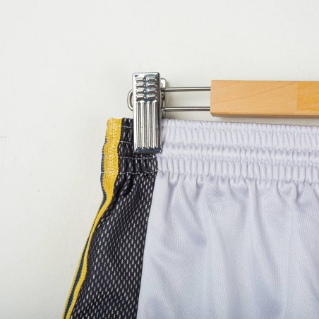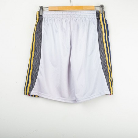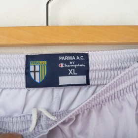 Parma third shorts from the 2000/2001 season, made by Champion. White with yellow-blue side inserts and Champion tape. Number 17 printed on the front. Embroidered Champion logo and stitched Parma A.C. crest on the leg. Elastic waistband with adjustable drawstring. Size XL. Official match shorts, rare collectible item from one of Parma’s European campaigns.